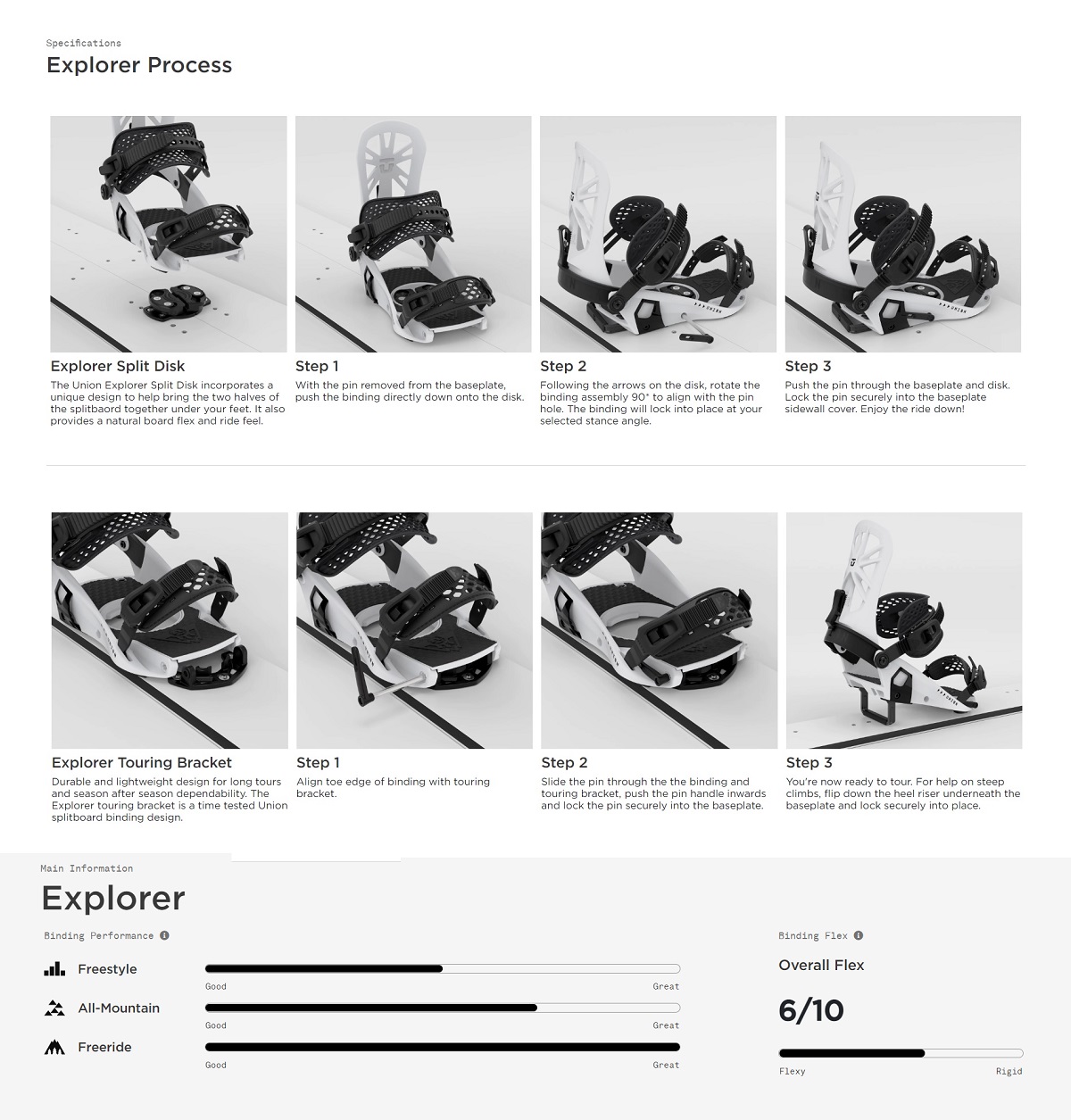 Splitboardové vázání Union Explorer poskytuje vynikající zážitek z jízdy, přesně jako u běžného snowboardového vázání, při zachování pohodlí přístupu a je jedním z cenově nejvýhodnějších řešení ve své kategorii.