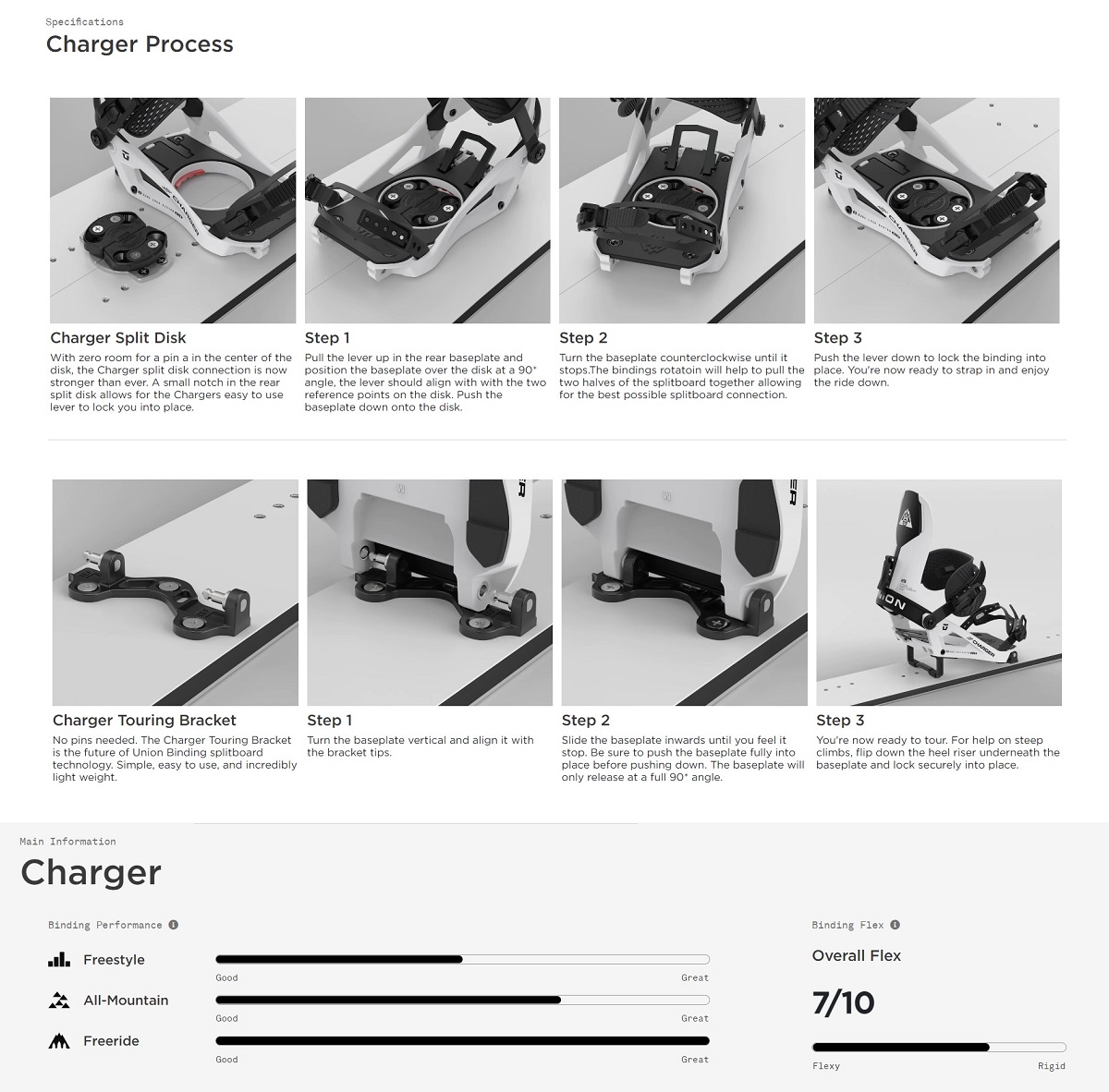 Splitboardové vázání Union Charger je úplnou novinkou od společnosti Union. Nový systém vázání bez kolíků