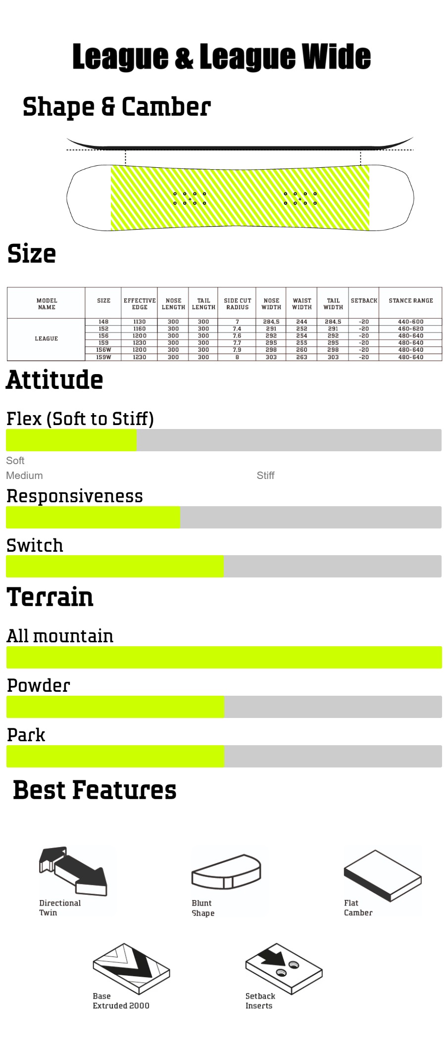 Tabule Drake League - pokud hledáte prkno s měkkou flexí a plochým profilem, ale přesto směrové, je to prkno pro vás. League je all mountain prkno určené pro začínající nebo středně pokročilé snowboardisty, kteří chtějí rozvíjet všechny aspekty své jízdy.